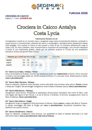 Crociera in Caicco Antalya Costa Lycia con volo da MXP e FCO ogni lunedì 8 giorni